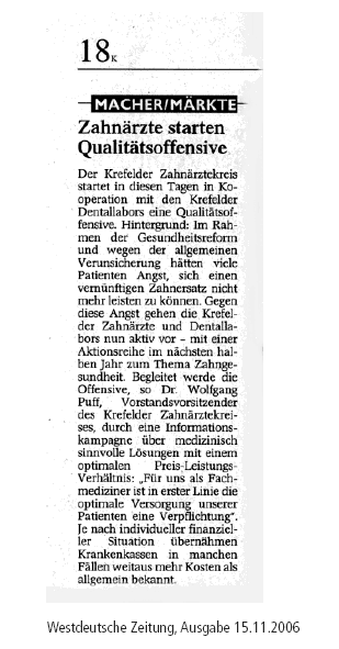 Der Krefelder Zahnärztekreis startet in diesen Tagen in Kooperation mit den Krefelder Dentallabors eine Qualitätsoffensive. Hintergrund: Im Rahmen der Gesundheitsreform und wegen der allgemeinen Verunsicherung hätten viele Patienten Angst sich einen vernünftigen Zahnersatz nicht mehr leisten zu können. Gegen diese Angst gehen die Krefelder Zahnärzte und Dentallabors nun aktiv vor – mit einer Aktionsreihe im nächsten halben Jahr zum Thema Zahngesundheit. Begleitet werde die Offensive, so Dr. Wolfgang Puff , Vorstandsvorsitzender des Krefelder Zahnärztekreises, durch eine Informationskampagne über medizinisch sinnvolle Lösungen mit einem optimalen Preis-Leistungs-Verhältnis:“ Für uns als Fachmediziner ist in erster Linie die optimale Versorgung unserer Patienten eine Verpflichtung“. Je nach Finanzieller Situation übernähmen die Krankenkassen in manchen Fällen weitaus mehr Kosten als allgemein bekannt. |