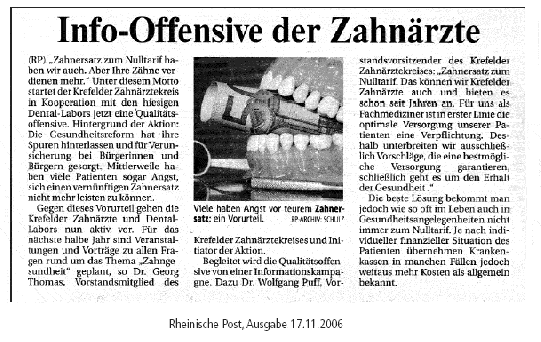 Begleitet wird die Qualitätsoffensive von einer Informationskampagne. Dazu Dr. Wolfgang Puff, Vorstandsvorsitzender des Krefelder Zahnärztekreises: „Zahnersatz zum Nulltarif. Das können wir Krefelder Zahnärzte auch und bieten es schon seit Jahren an. Für uns als Fachmediziner ist in erster Linie die optimale Versorgung unserer Patienten eine Verpflichtung. Deshalb unterbieten wir ausschließlich Vorschläge, die eine bestmögliche Versorgung garantieren, schließlich geht es um den Erhalt der Gesundheit.“