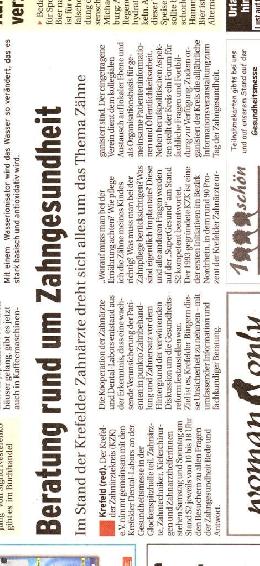 Krefeld (red). Der Krefelder Zahnärztekreis (KZK) e.V. nimmt gemeinsam mit den Krefelder Dental-Labors an der Gesundheitsmesse in der Glockenspitzhalle teil. Zahnärzte, Zahntechniker, Kieferchirurgen und Zahnarzthelferinnen stehen Samstag und Sonntag am Stand S2 jeweils von 10 bis 18 Uhr den Besuchern zu allen Fragen der Zahngesundheit Rede und Antwort.